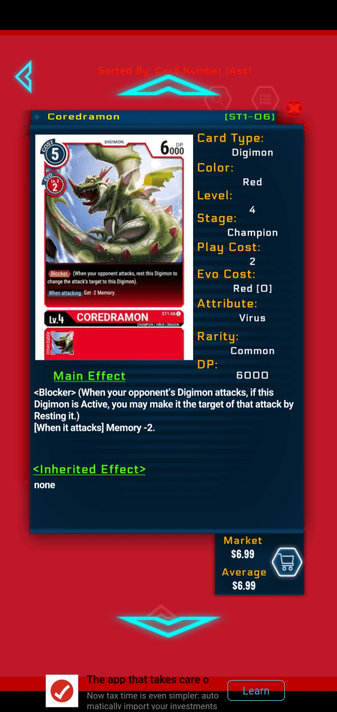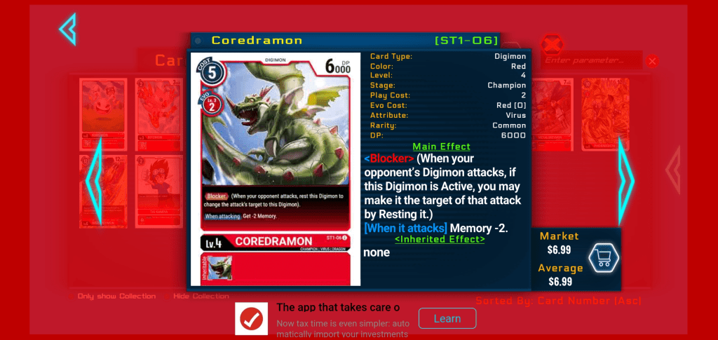 Card Pricing – The app now supports card pricing and card buying! If the card has a current TCGPlayer.com price, it will appear on the bottom right of the screen when viewing a card. From there, you can click the Shopping Cart button to open a browser link where you can purchase the card!